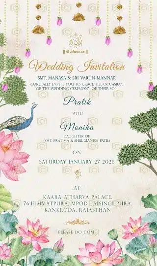 Previous Product Next Product Beautiful Ganesha Wedding Invitation Showcasing A Lotus And Peacock, Merging Nature And Tradition In A Vibrant DesignINR ₹500 Beautiful Ganesha Wedding Invitation Showcasing A Lotus And Peacock, Merging Nature And Tradition In A Vibrant Design quantity Add to cart Categories: Ecards, Instant Preview Cards Tags: Cartoon, Elegant, Hindu, Marwari, North Indian, Rajasthani, South Indian, Telugu, Traditional INR USD Share DesignAn unique URL to share will be created for you... Additional information Additional informationEventWeddingRelated products Quick View Quick ViewEcardsVintage Rustic Sand theme Wedding Date Postpone Card INR ₹300Add to cart Quick View Quick ViewEcardsRoyal Blue theme, Luxurious Wedding Save the Date Card INR ₹250Rated 5.00 out of 5Add to cart Quick View Quick ViewEcardsWedding Save The Date Whatsapp Status Card INR ₹200Rated 5.00 out of 5Add to cart